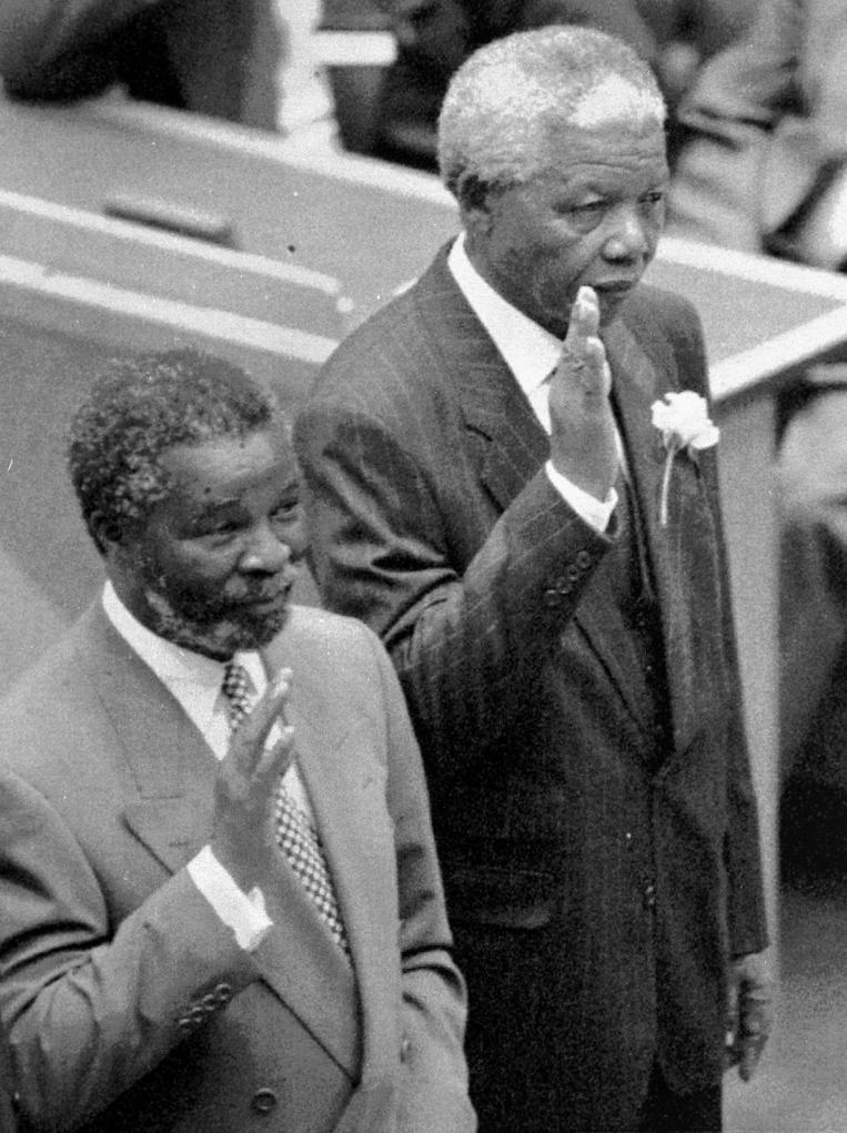 1994年5月9日,納爾遜·曼德拉(右)在南非首次多種族大選中當(dāng)選為南非歷史上第一位黑人總統(tǒng)。新華社發(fā)