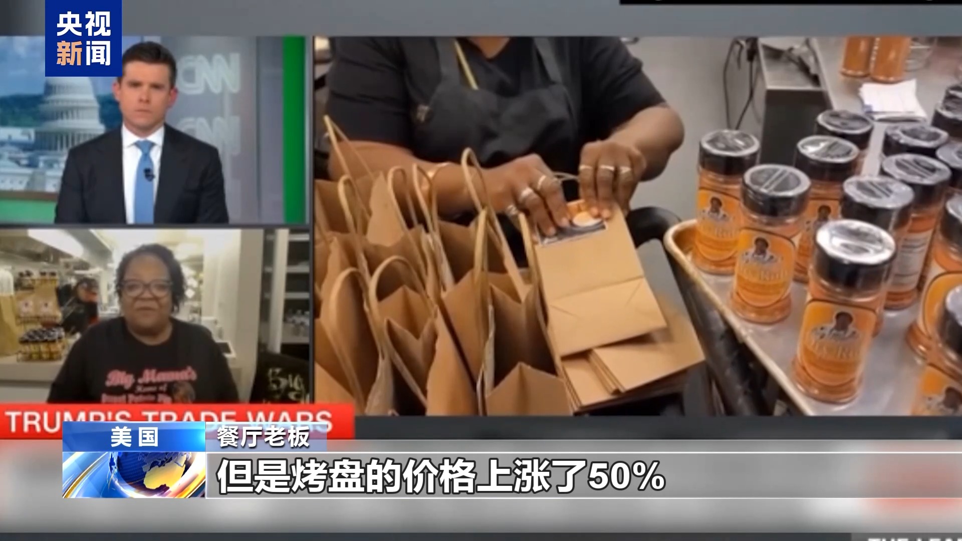 餐廳老板:我們餐廳的炸雞產(chǎn)品上過電視臺(tái)的節(jié)目,我們也在線上賣調(diào)料產(chǎn)品,這是關(guān)稅影響最大的地方。另外就是餐廳的供應(yīng),比如我們使用谷物面包,我們一般用鋁箔烤盤制作面包,但是烤盤的價(jià)格上漲了50%,所以我們現(xiàn)在換回平底鍋制作面包。