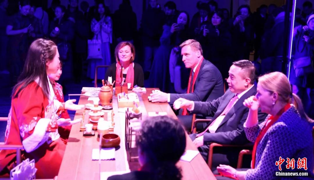 2025年2月13日,中國駐歐盟使團(tuán)在布魯塞爾燈光節(jié)組織“光影茶榭”活動(dòng),中國駐歐盟使團(tuán)團(tuán)長蔡潤(右排圖中)邀請(qǐng)嘉賓品茗,體驗(yàn)中國茶藝。中新社記者 德永健 攝