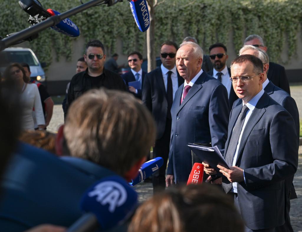 6月2日,在土耳其伊斯坦布爾舉行的俄烏第二輪直接談判結(jié)束后,俄羅斯總統(tǒng)助理、俄方談判代表團(tuán)團(tuán)長(zhǎng)梅金斯基(右一)向媒體公布談判結(jié)果。新華社記者劉磊攝