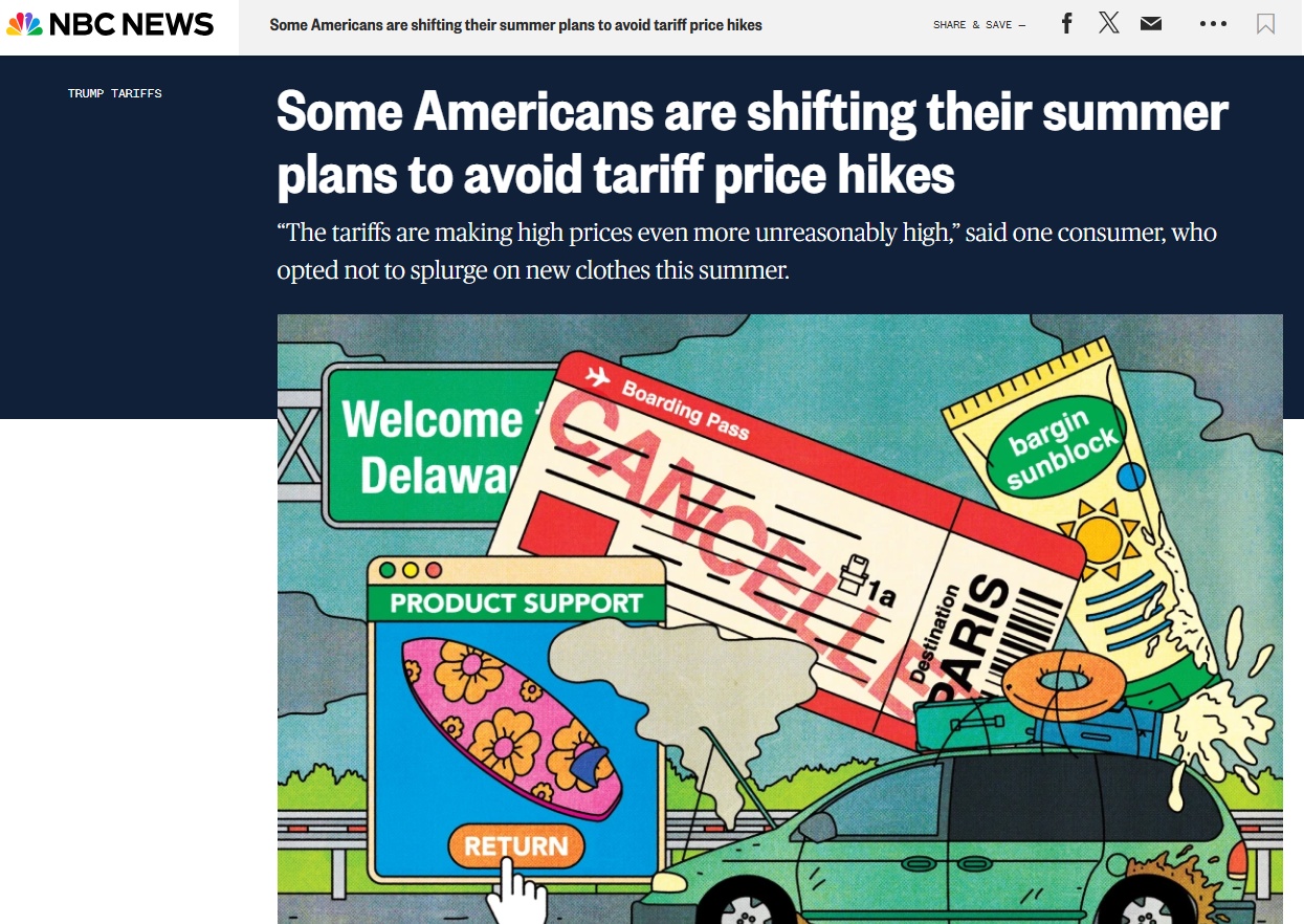 對(duì)于美國(guó)普通消費(fèi)者而言,關(guān)稅也讓他們今年的夏天和往年有所不同。美國(guó)全國(guó)廣播公司網(wǎng)站近日的一篇文章說(shuō),美國(guó)政府的關(guān)稅政策,讓美國(guó)消費(fèi)者對(duì)自身成本的擔(dān)憂持續(xù)加劇,他們不得不減少休閑活動(dòng)和購(gòu)物狂歡。