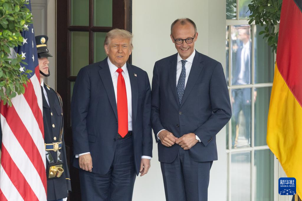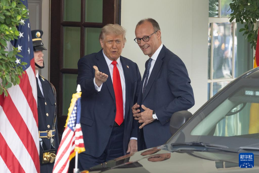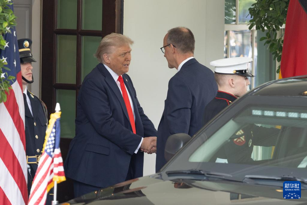 6月5日,美國總統(tǒng)特朗普在華盛頓白宮迎接到訪的德國總理默茨。新華社記者 胡友松 攝