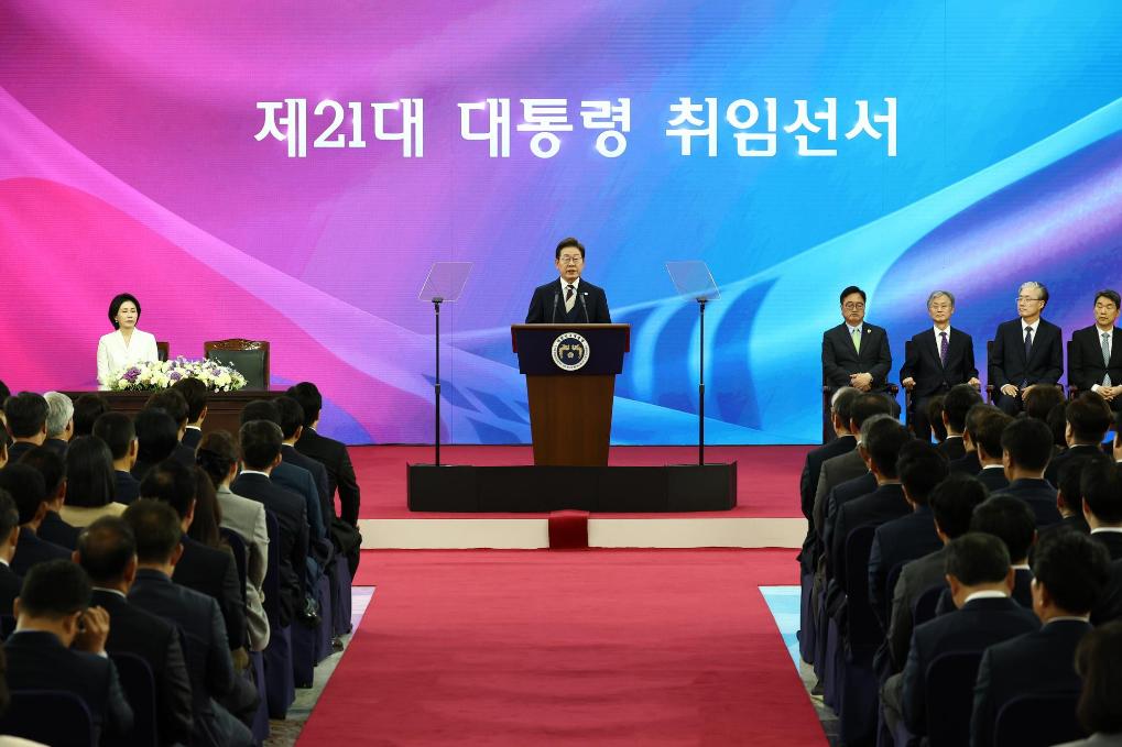 6月4日,在韓國首爾,李在明在韓國國會(huì)發(fā)表就職講話。新華社發(fā)