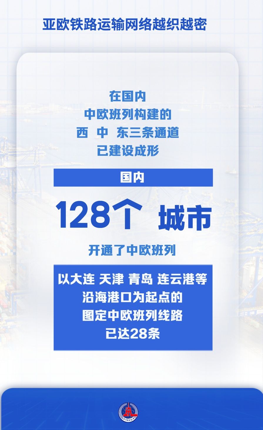 在國內(nèi),中歐班列構(gòu)建的西、中、東三條通道已建設(shè)成形,國內(nèi)128個城市開通了中歐班列,以大連、天津、青島、連云港等沿海港口為起點的圖定中歐班列線路已達(dá)28條。