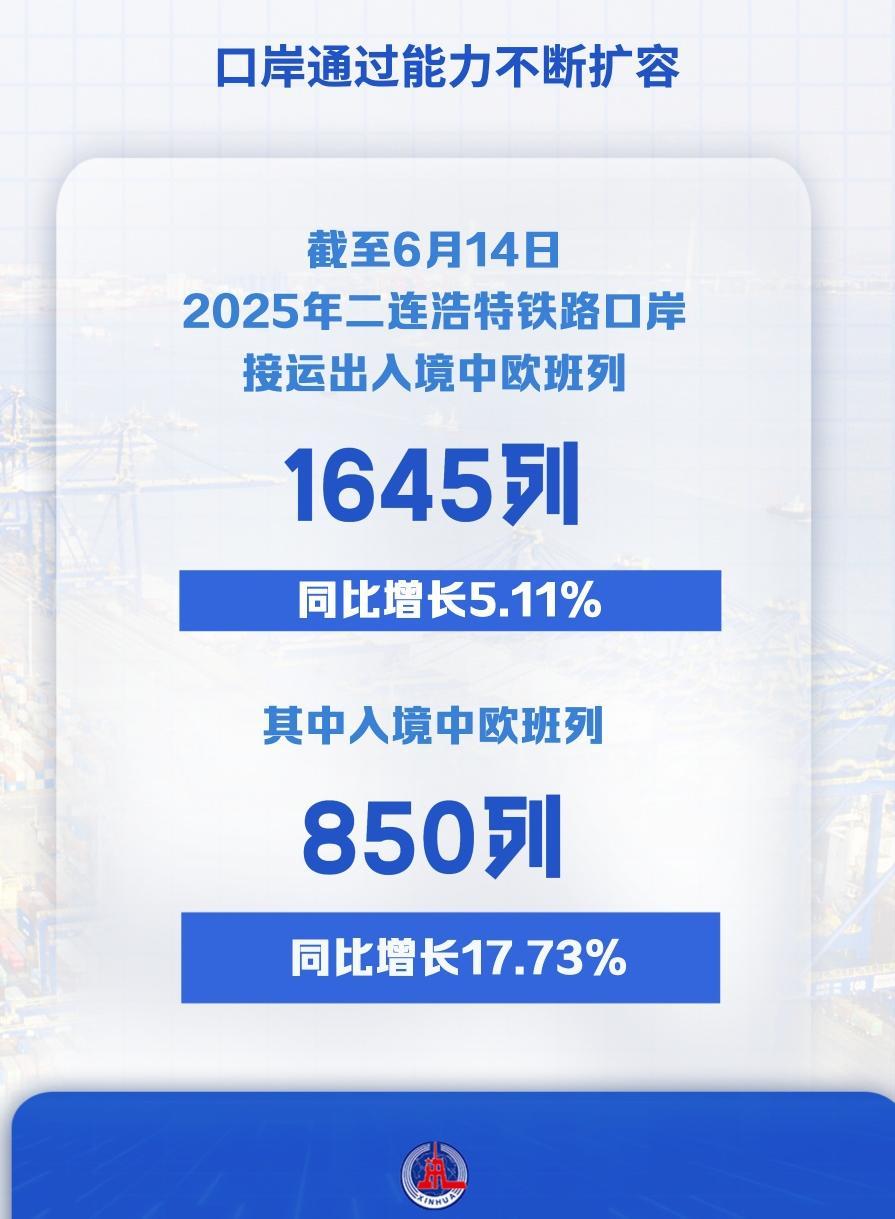 二連浩特口岸是中歐班列中通道進(jìn)出境的唯一鐵路口岸,截至6月14日,2025年二連浩特鐵路口岸接運出入境中歐班列1645列,同比增長5.11%,其中入境中歐班列850列,同比增長17.73%。