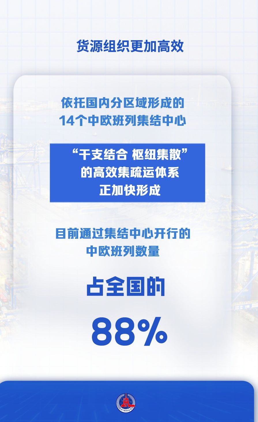 依托國內(nèi)分區(qū)域形成的14個中歐班列集結(jié)中心,“干支結(jié)合、樞紐集散”的高效集疏運體系正加快形成,目前通過集結(jié)中心開行的中歐班列數(shù)量占全國的88%。