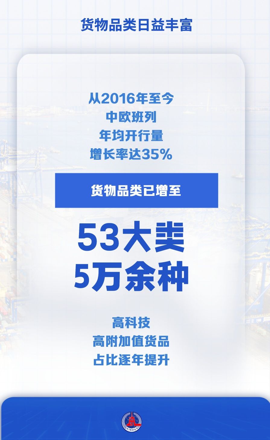從2016年至今,中歐班列年均開行量增長率達(dá)35%,貨物品類已增至53大類5萬余種,高科技、高附加值貨品占比逐年提升。