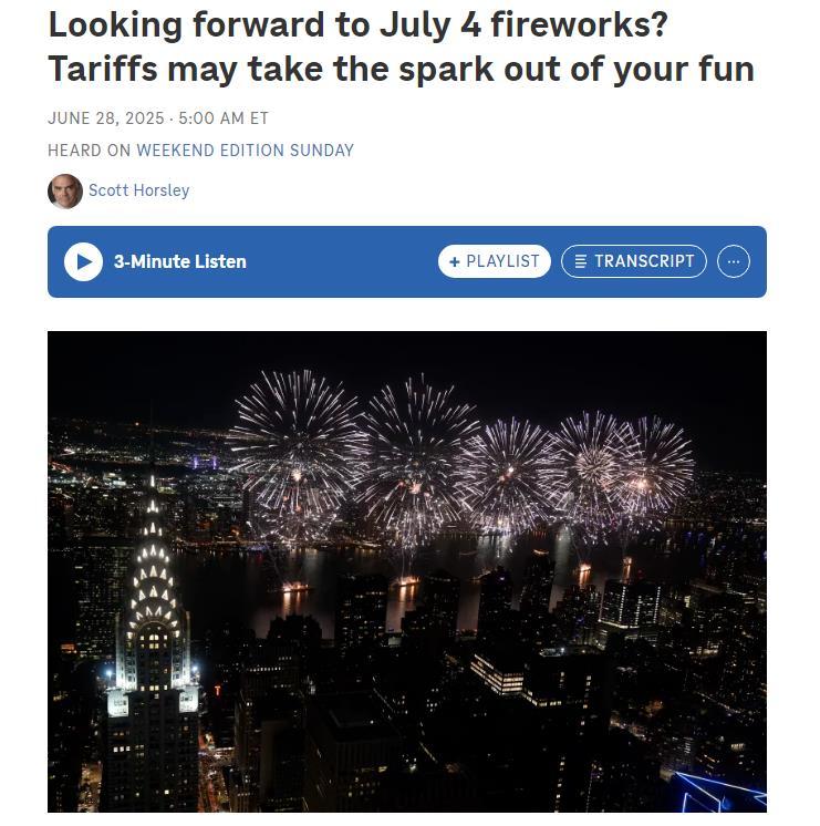 美國全國公共廣播電臺網站近日發(fā)表一篇文章說,美國人即將迎來獨立日慶典,燒烤派對、節(jié)日游行和煙花表演自然是重頭戲。但受特朗普政府加征關稅影響,今年煙花價格可能飆升,供應也將更加緊俏。這是因為,美國用于慶祝獨立日的火箭煙花、手持電光花和噴泉禮花,幾乎完全依賴中國供應——而早在一千多年前,正是中國人發(fā)明了煙花。