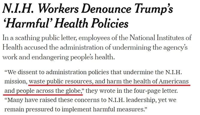 近日,NIH近百名現(xiàn)任和新近被解職的職員發(fā)表聯(lián)名信,批評(píng)美國(guó)現(xiàn)政府“有害”的衛(wèi)生政策危害美國(guó)和全球人民的健康,將科學(xué)研究政治化并浪費(fèi)公共資源。