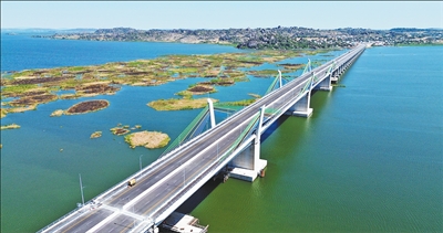 隨著坦桑尼亞總統(tǒng)哈桑揮動(dòng)國(guó)旗,示意車(chē)輛可以通行,等待駛過(guò)馬古富力大橋的首批車(chē)輛紛紛啟動(dòng)。身穿當(dāng)?shù)貍鹘y(tǒng)服飾的民眾載歌載舞,現(xiàn)場(chǎng)歡呼聲、歌聲、掌聲交織在一起……日前,由中國(guó)土木與中鐵十五局聯(lián)合承建的非洲最長(zhǎng)矮塔斜拉橋——坦桑尼亞馬古富力大橋(見(jiàn)圖,中國(guó)土木供圖)建成通車(chē)。橫跨維多利亞湖的馬古富力大橋如一道飛虹連通兩岸,成為中非友誼新地標(biāo)。