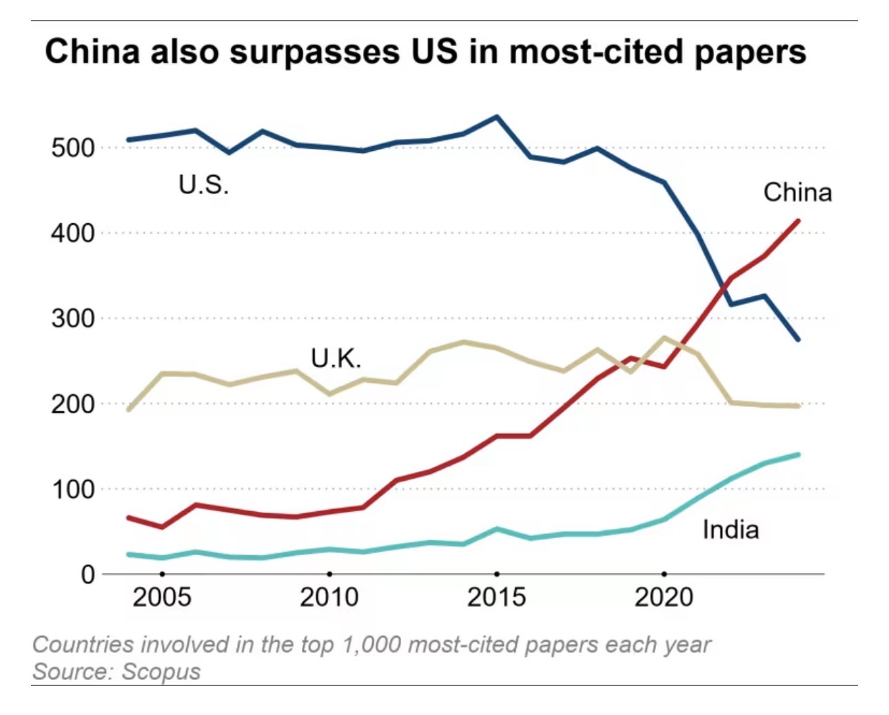 文章表示,中國(guó)氣候變化研究論文在其他文獻(xiàn)中的引用次數(shù)也在顯著增加——這是研究質(zhì)量的一個(gè)重要標(biāo)志。從2004年到2024年,每年被引用次數(shù)最多的1000篇論文中,中國(guó)在2022年超越美國(guó),占據(jù)了領(lǐng)先地位。