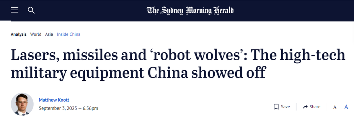 澳大利亞《悉尼先驅(qū)晨報》報道稱,中國閱兵式上展示了彈道導彈、激光武器、戰(zhàn)斗機、水下無人潛航器,甚至還有“機器狼”。