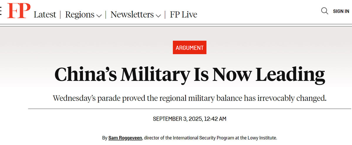 洛伊研究所國際安全項目主任薩姆·羅格維恩在美國《外交政策》網(wǎng)站撰文稱,西方的軍事規(guī)劃人員會對閱兵式上展出的裝備感到驚訝,已經(jīng)不能再說中國軍隊在迎頭趕上,或者所謂“抄襲”外國軍事裝備設計,“中國軍備正在創(chuàng)新,并且處于領(lǐng)先地位”。