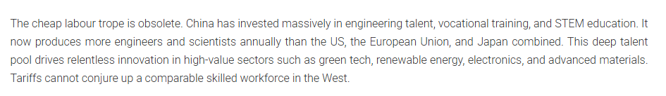 中國在工程人才、職業(yè)培訓(xùn)以及科學(xué)、技術(shù)、工程和數(shù)學(xué)教育等方面投入了大量資金。現(xiàn)在,它每年培養(yǎng)的工程師和科學(xué)家比美國、歐盟和日本的總和還要多。這種深厚的人才庫推動了綠色技術(shù)、可再生能源、電子和先進(jìn)材料等高價值領(lǐng)域的不懈創(chuàng)新。