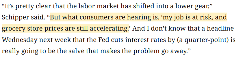 美國圣托馬斯大學副教授泰勒·施普爾 (Tyler Schipper)認為 :對普通消費者來說,耳邊最真切的聲音是“我的工作隨時可能保不住”,是“超市里的食品雜貨價格還在一個勁往上漲”。所以我實在不確定,下周“美聯(lián)儲降息”的頭條新聞,真能成為化解這些現(xiàn)實困境的良藥嗎?