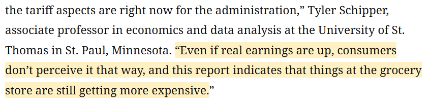 經濟學家泰勒 施皮珀(Tyler Schipper)直言:“老百姓感受不到工資上漲,他們只知道超市商品的價格越來越貴?!?/p>