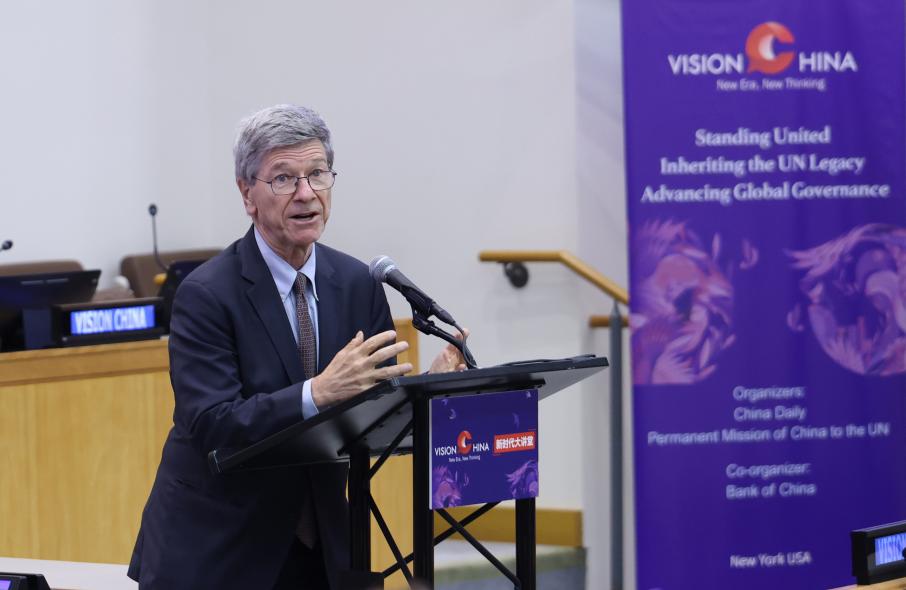 哥倫比亞大學(xué)可持續(xù)發(fā)展中心主任、教授杰弗里·薩克斯發(fā)表演講。中國日報記者 馮永斌 攝