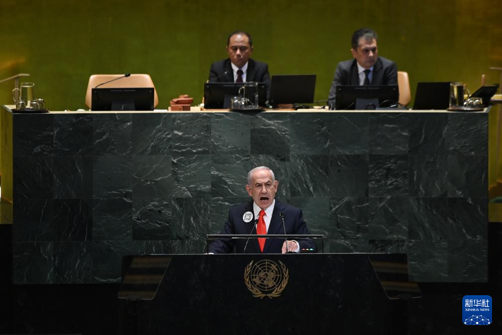 9月26日,在位于紐約的聯(lián)合國(guó)總部,以色列總理內(nèi)塔尼亞胡在第80屆聯(lián)合國(guó)大會(huì)一般性辯論發(fā)言。眾多聯(lián)合國(guó)會(huì)員國(guó)代表起身離席,退場(chǎng)抗議。新華社記者吳曉凌攝