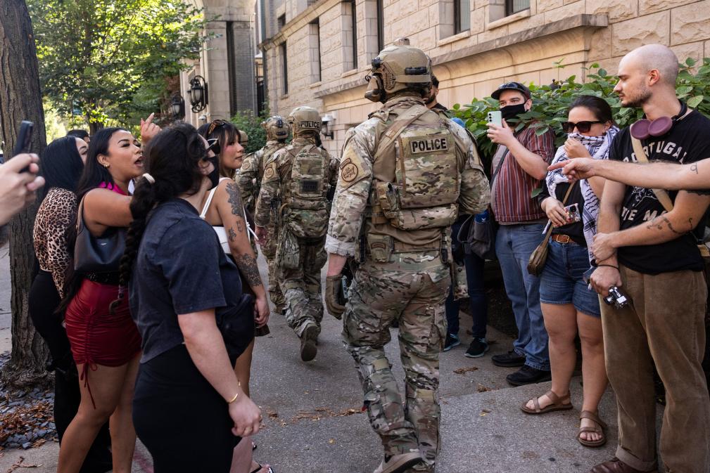 據(jù)美聯(lián)社報道,28日,數(shù)十名全副武裝的聯(lián)邦執(zhí)法人員在芝加哥市一些著名的旅游和購物區(qū)巡邏,吸引不少購物者和在街邊咖啡館用餐的家庭注意,許多人拿出手機(jī)錄像。