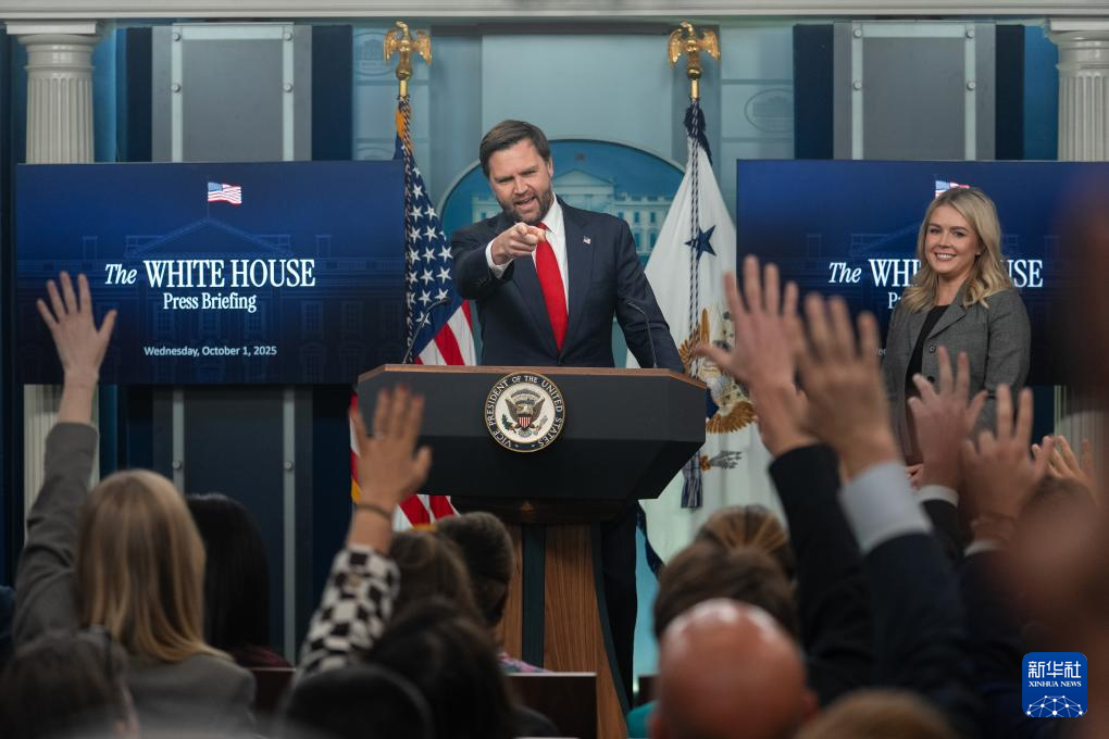 10月1日,在美國首都華盛頓白宮,美國副總統(tǒng)萬斯(左)請記者提問。新華社記者胡友松攝