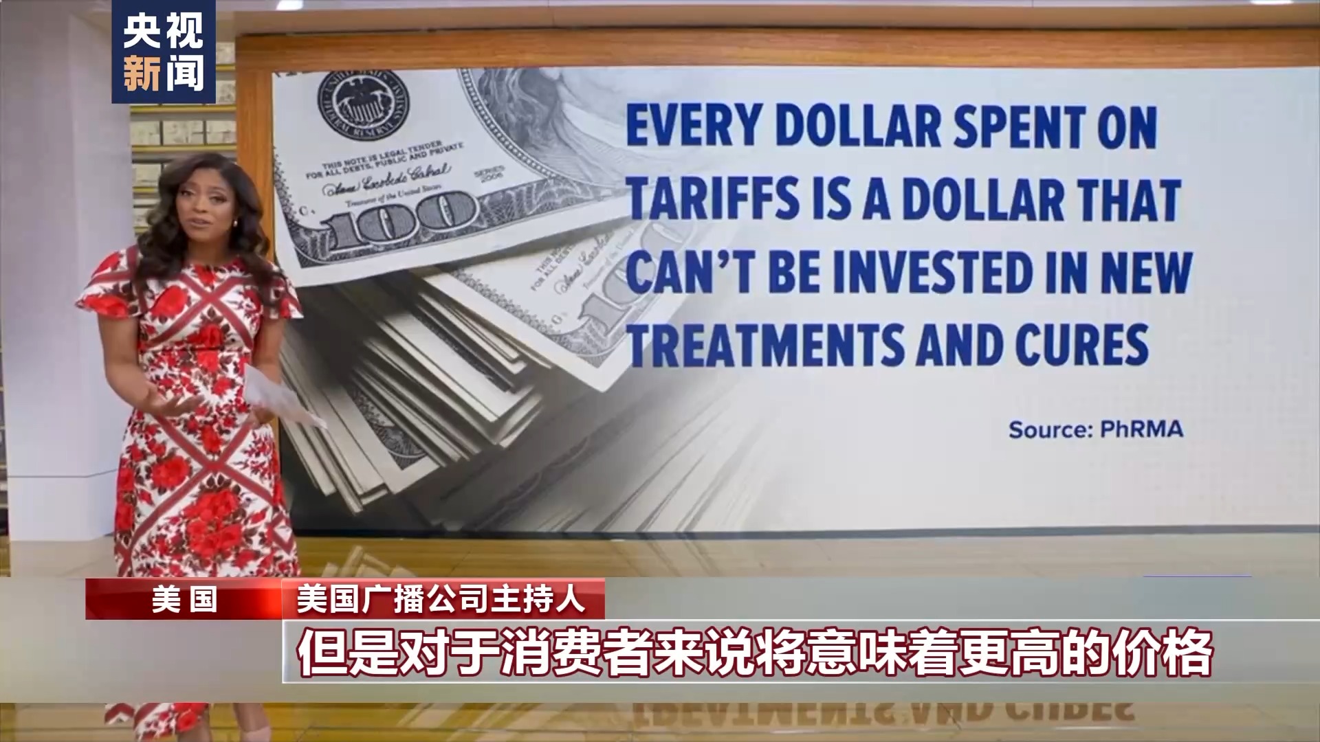 美國廣播公司主持人:美國藥物研究機構(gòu)和制藥廠商協(xié)會指出,在關(guān)稅上多花的每一美元,都無法用于投資新治療方法的開發(fā)。政府說加關(guān)稅是為了國家安全、為了提振美國制造業(yè),但是對于消費者來說,將意味著更高的價格。