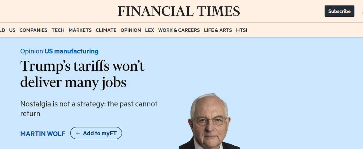 英國《金融時(shí)報(bào)》副總編及首席經(jīng)濟(jì)評論員馬丁·沃爾夫(Martin Wolf)8日發(fā)表評論文章稱,事實(shí)表明,特朗普政府推行的貿(mào)易保護(hù)主義政策,并未兌現(xiàn)其對選民所作的核心承諾——為美國創(chuàng)造大量制造業(yè)就業(yè)崗位,尤其是面向那些曾經(jīng)依賴傳統(tǒng)工業(yè)、如今卻面臨地區(qū)經(jīng)濟(jì)衰落困境的工人群體。他進(jìn)一步指出,這一承諾本質(zhì)上是空洞的,其政策實(shí)質(zhì)是為政府自身及其背后的富豪階層牟取利益。