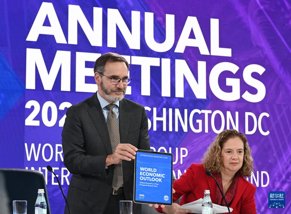 10月14日,在美國華盛頓,國際貨幣基金組織首席經(jīng)濟學家皮埃爾-奧利維耶·古蘭沙(左)在《世界經(jīng)濟展望報告》新聞發(fā)布會上展示報告。新華社記者 李睿 攝