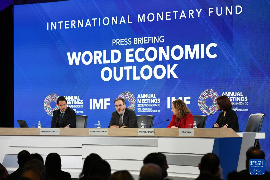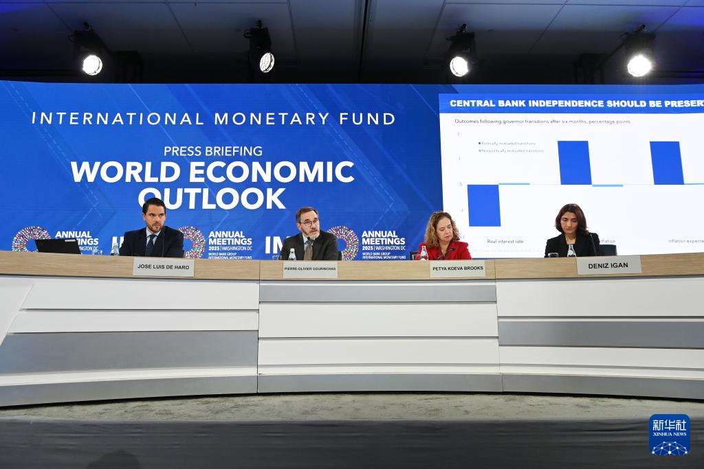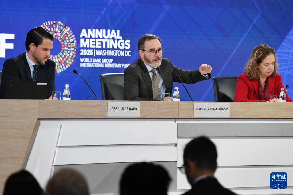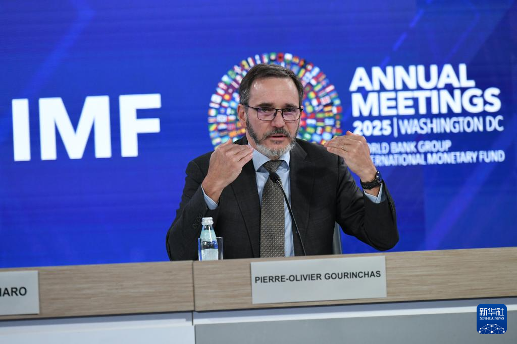 10月14日,在美國華盛頓,國際貨幣基金組織首席經(jīng)濟學家皮埃爾-奧利維耶·古蘭沙(中)在《世界經(jīng)濟展望報告》新聞發(fā)布會上講話。新華社記者 李睿 攝