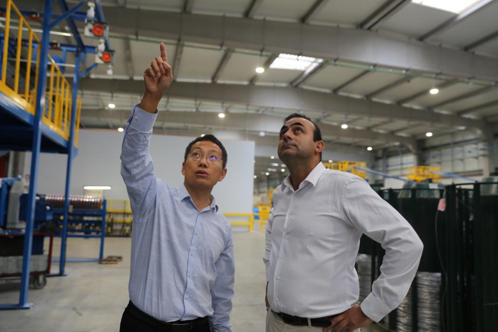 10月3日,在葡萄牙北部奧瓦爾市,亨通集團駐葡萄牙的設(shè)備經(jīng)理劉建龍(左)與阿爾科夫雷電纜廠首席運營官卡洛斯·格蘭雅討論技術(shù)問題。新華社記者荀偉攝