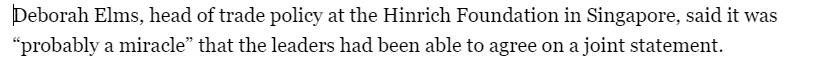 半島電視臺也關(guān)注了此次峰會(huì),報(bào)道援引新加坡欣里奇基金會(huì)貿(mào)易政策負(fù)責(zé)人黛博拉 埃爾姆斯的話說,各成員領(lǐng)導(dǎo)人能夠就聯(lián)合聲明達(dá)成一致是“了不起的事情”。他說,鑒于亞太經(jīng)合組織經(jīng)濟(jì)體的不同立場,要將任何達(dá)成一致的措辭寫入文件都是一項(xiàng)“充滿挑戰(zhàn)的工作”。