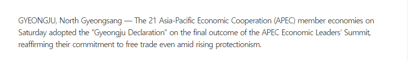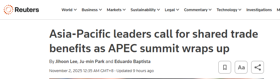 2025年亞太經(jīng)合組織(APEC)領(lǐng)導(dǎo)人非正式會(huì)議于10月31日至11月1日在韓國慶州舉行,會(huì)議發(fā)表了《慶州宣言》。多家外媒報(bào)道稱,會(huì)議凸顯了亞太地區(qū)經(jīng)濟(jì)體對自由貿(mào)易的承諾。