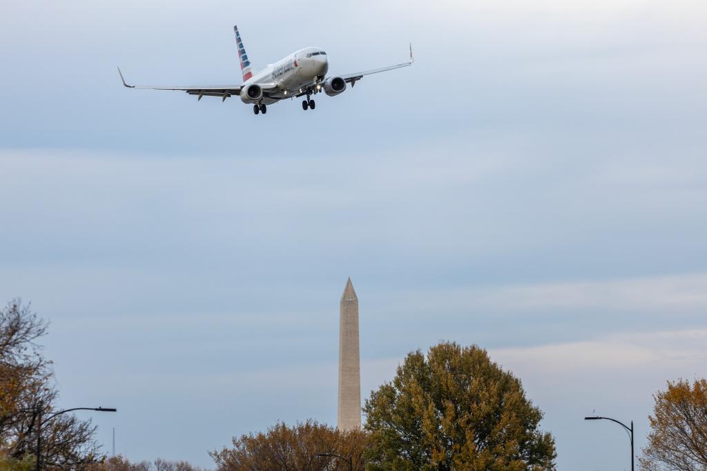 11月7日,一架美國航空公司飛機準(zhǔn)備降落在美國弗吉尼亞州阿靈頓的里根國家機場。新華社記者胡友松攝