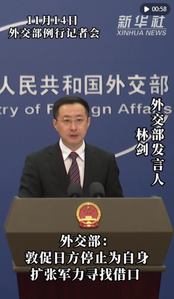 新華社北京11月14日電(記者董雪、劉楊)外交部發(fā)言人林劍11月14日表示,中方對日方近期軍事安全動向感到嚴(yán)重關(guān)切,敦促日方停止為自身擴(kuò)張軍力尋找借口。