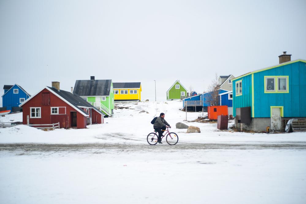 3月22日,在丹麥自治領(lǐng)地格陵蘭島納爾薩克,一名男子在街道上騎行。新華社記者彭子洋攝