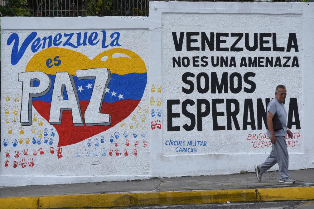 2025年9月22日,在委內(nèi)瑞拉首都加拉加斯,行人從街頭的宣傳標(biāo)語(yǔ)前走過(guò)。標(biāo)語(yǔ)上寫(xiě)著“委內(nèi)瑞拉是和平國(guó)度”“委內(nèi)瑞拉不是威脅,而是希望”。新華社發(fā)(馬科斯·薩爾加多攝)