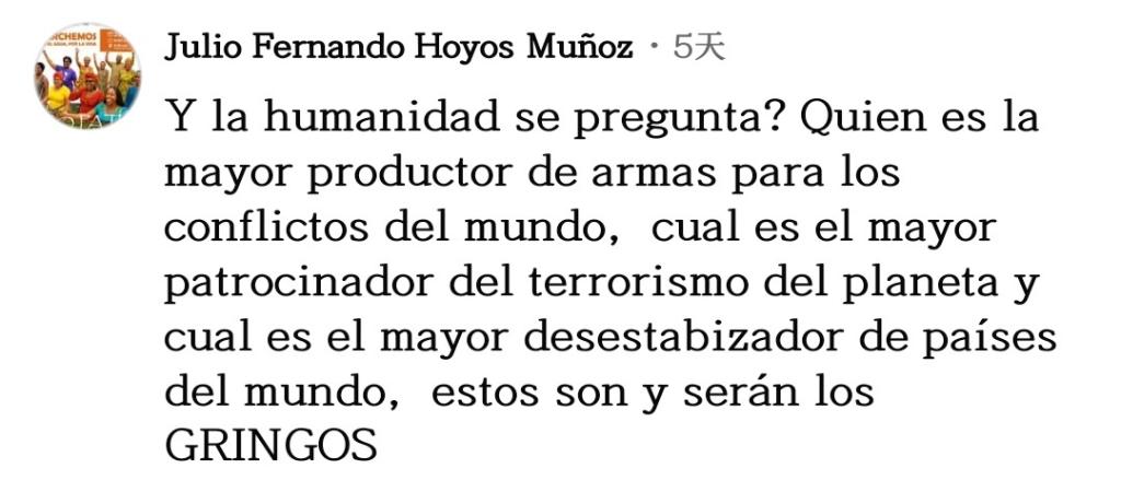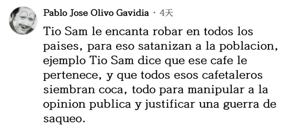 網(wǎng)友巴勃羅·奧利沃留言說(shuō):“山姆大叔喜歡在所有國(guó)家盜竊,為此他們妖魔化民眾,譬如山姆大叔說(shuō)那片咖啡園是屬于他的,還說(shuō)所有那些咖啡農(nóng)在種植古柯,所有這一切都是為了操弄輿論,為了給他們的掠奪戰(zhàn)爭(zhēng)辯護(hù)?!?/p>