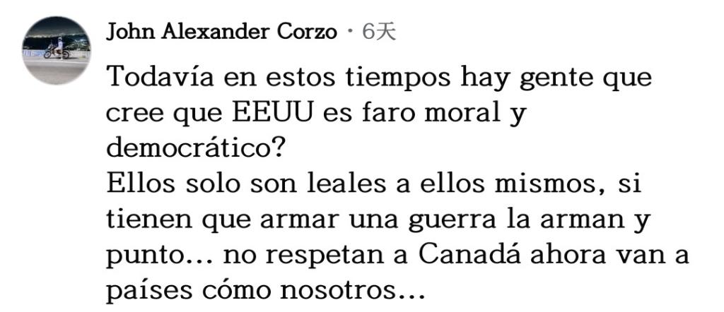 網(wǎng)友約翰·科爾索坦言道:“時(shí)至今日,還有人相信美國(guó)是道德和民主的燈塔嗎?他們只忠于自己,如果需要發(fā)動(dòng)一場(chǎng)戰(zhàn)爭(zhēng),他們隨時(shí)會(huì)發(fā)動(dòng),僅此而已!他們連加拿大都不尊重,現(xiàn)在矛頭對(duì)準(zhǔn)我們這樣的國(guó)家了。”
