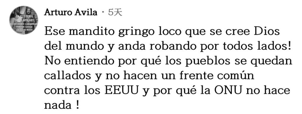 網(wǎng)友阿爾圖羅·阿維拉表達(dá)不解:“美國(guó)自以為是世界之神,到處掠奪!我不明白為什么各國(guó)人民依然保持沉默,而不是組成一個(gè)共同陣線對(duì)抗美國(guó)。”