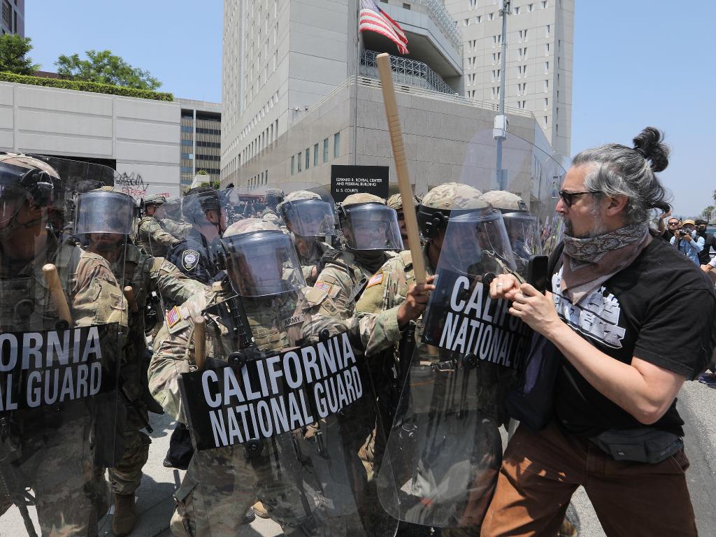 2025年6月8日,在美國加利福尼亞州洛杉磯市中心的聯(lián)邦執(zhí)法機構(gòu)門前,抗議者與國民警衛(wèi)隊人員發(fā)生沖突。新華社發(fā)(邱晨攝)