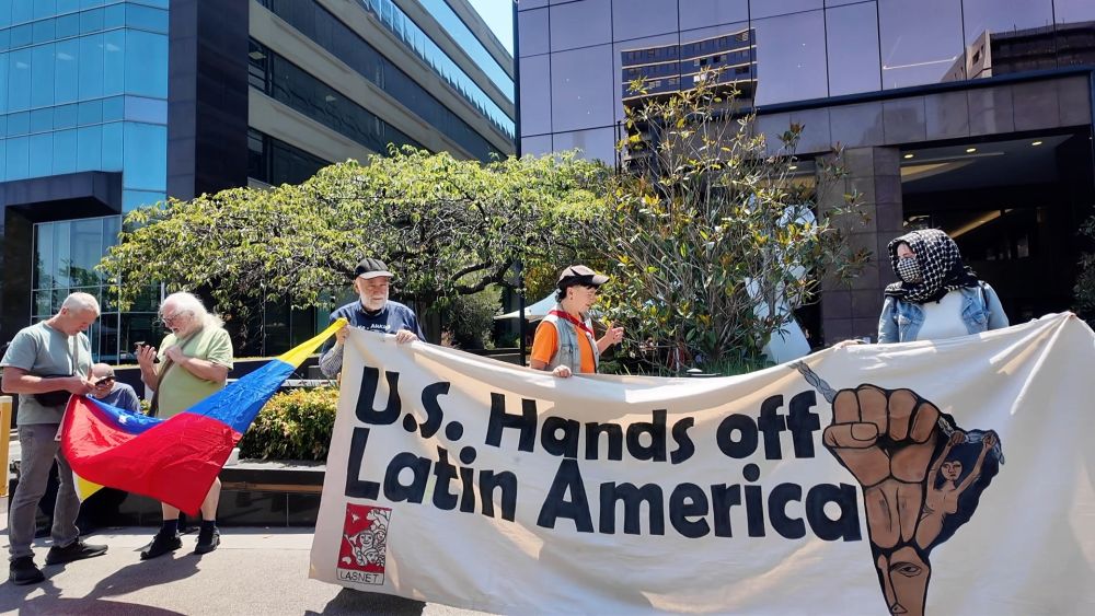 1月12日,澳大利亞墨爾本民眾在美國駐墨爾本總領(lǐng)事館門口舉行抗議活動??棺h者手持委內(nèi)瑞拉國旗以及寫有“美國停止干涉委內(nèi)瑞拉”字樣的旗幟,反對美國對委內(nèi)瑞拉的軍事行動。