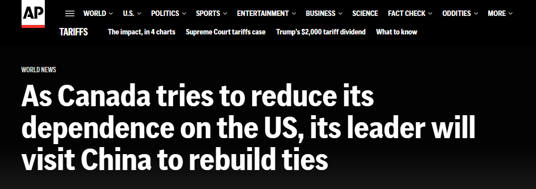 美聯(lián)社報道稱,加拿大總理此次訪華,旨在修復并改善兩國關系,為中加戰(zhàn)略伙伴關系的發(fā)展重新注入活力。報道援引卡尼的表態(tài)指出:“加拿大正在全球范圍內(nèi)構建新的伙伴關系,以改變本國經(jīng)濟對單一貿(mào)易伙伴的依賴?!?/p>