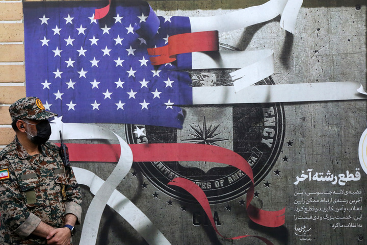 2025年11月4日,在伊朗首都德黑蘭舉行的集會(huì)上,安全人員站在反美宣傳畫前。當(dāng)天,伊朗多地民眾舉行集會(huì),譴責(zé)美國霸權(quán)和以色列的侵略行為。新華社發(fā)