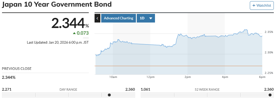 1月20日,日本長(zhǎng)期國(guó)債在東京債券市場(chǎng)繼續(xù)遭到拋售,導(dǎo)致收益率不斷上揚(yáng)。當(dāng)天,作為日本長(zhǎng)期利率指標(biāo)的10年期日本國(guó)債收益率一度上升至2.330%,為1999年2月以來的最高水平。這一市場(chǎng)異動(dòng)恰逢日本政局進(jìn)入敏感時(shí)段,引發(fā)投資者對(duì)經(jīng)濟(jì)前景的深度憂慮。