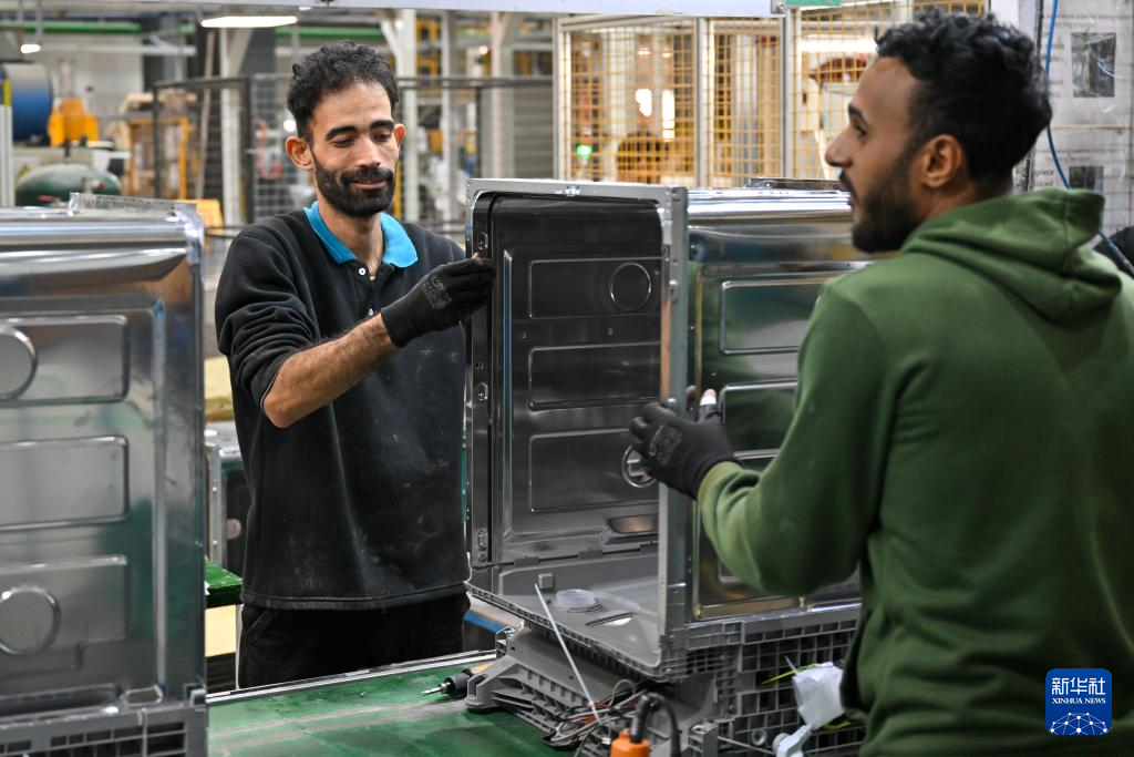 1月19日,在埃及蘇赫奈泉的中埃·泰達(dá)蘇伊士經(jīng)貿(mào)合作區(qū),埃及員工在美的埃及廚房和熱水器有限公司洗碗機(jī)生產(chǎn)車間組裝洗碗機(jī)。新華社記者 辛夢(mèng)晨 攝