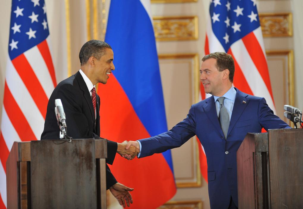 這張拍攝于2010年4月8日的資料照片顯示,時(shí)任美國(guó)總統(tǒng)奧巴馬(左)和時(shí)任俄羅斯總統(tǒng)梅德韋杰夫在捷克首都布拉格簽署新核裁軍條約后出席新聞發(fā)布會(huì)時(shí)握手。 新華社記者 武巍 攝