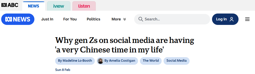 澳大利亞廣播公司2月8日發(fā)表題為《為何Z世代在社交媒體上開啟“我的人生很中國”時(shí)刻?》