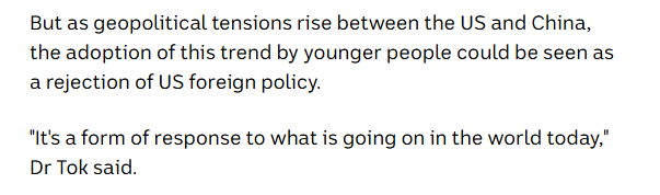 文章還說,許多創(chuàng)作“中國時(shí)刻”視頻的博主居住在美國。墨爾本大學(xué)亞洲研究院講師杜兆愷分析,年輕人的這種文化選擇或許是對美國外交政策的隱性反抗。“這是對當(dāng)今世界格局的回應(yīng)?!?/p>
