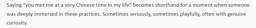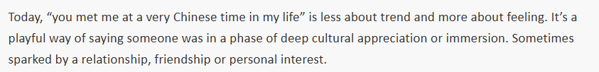 日本英文雜志《大都市》分析說,“你遇見了我人生中‘很中國’的時(shí)刻”,便成了沉浸于這類實(shí)踐的代名詞——有時(shí)認(rèn)真,有時(shí)輕松,但總帶著真誠的好奇。
