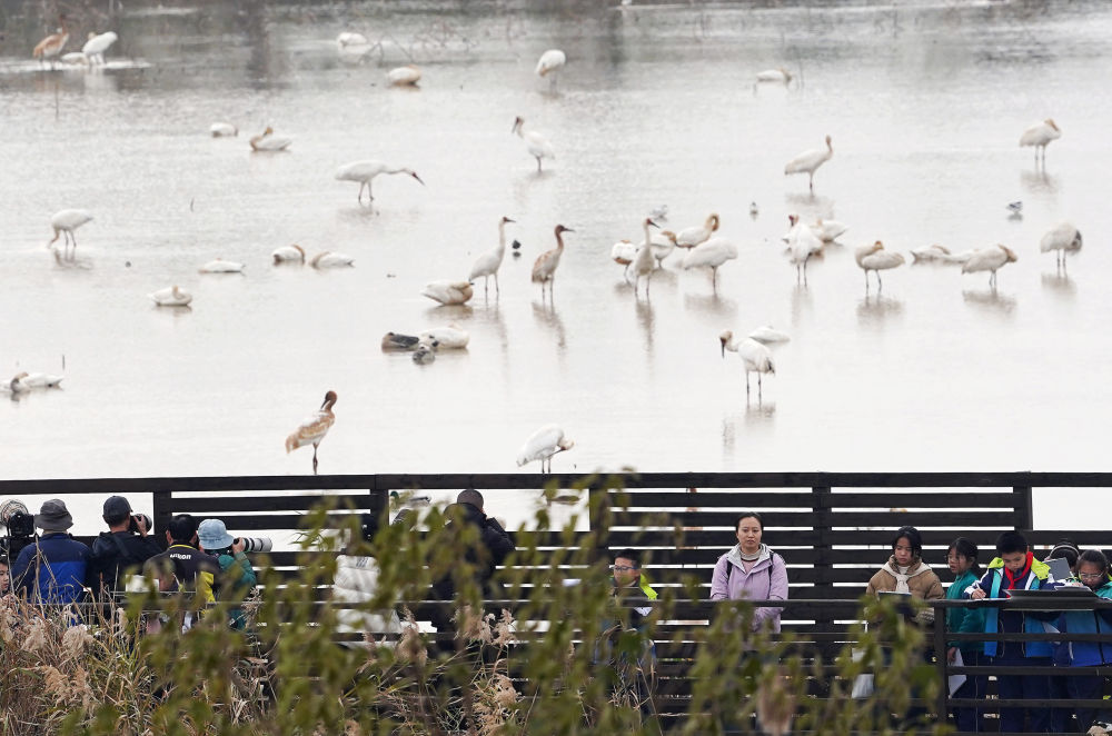 在鄱陽湖畔的江西省南昌市白鶴小鎮(zhèn),游客與學生們近距離觀察野生白鶴(2024年12月17日攝)。