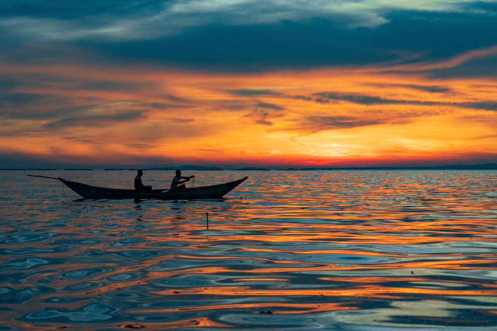 在肯尼亞基蘇木,漁民于日落時分駕船在維多利亞湖上捕魚(2026年2月27日攝)。